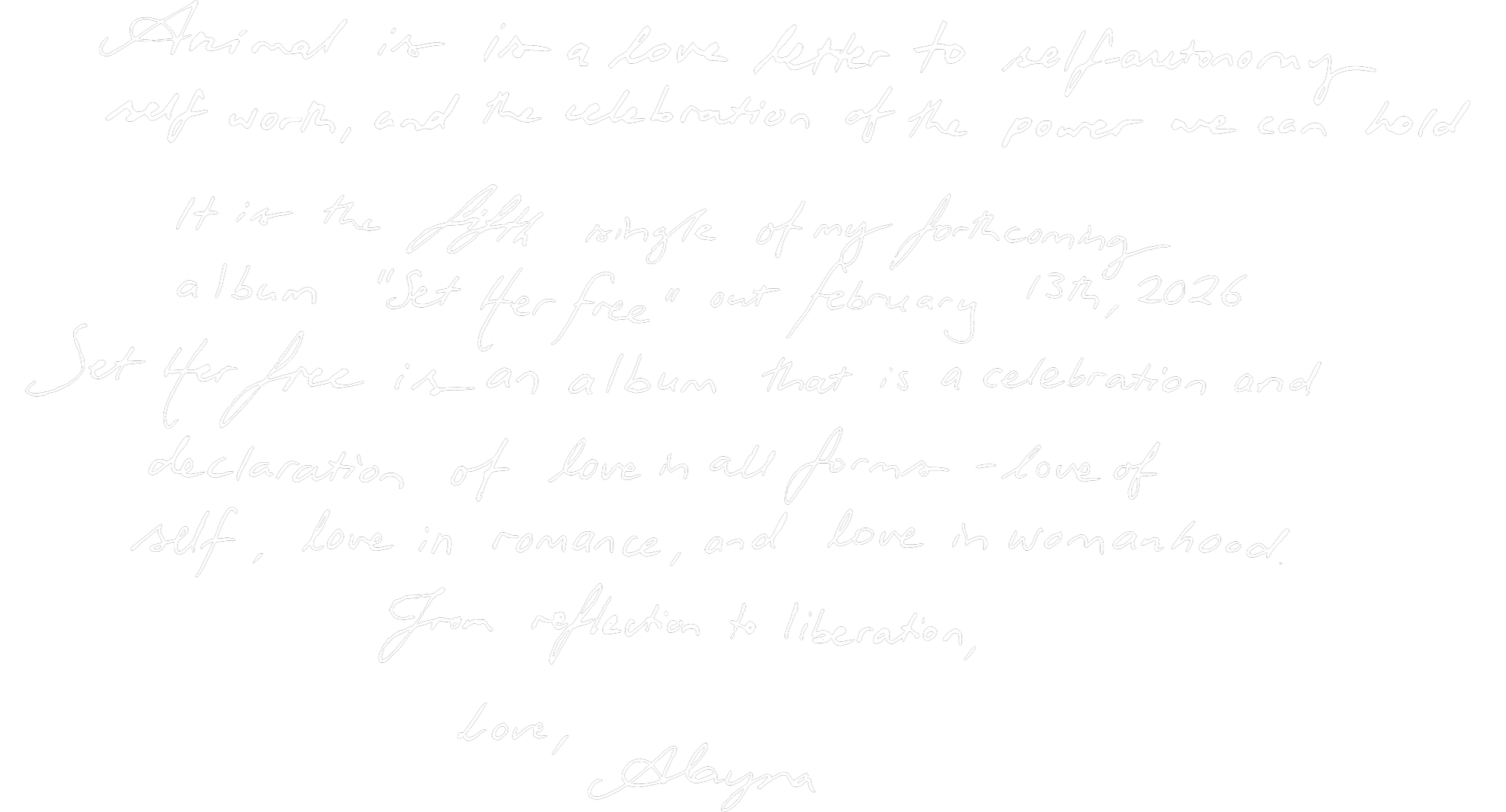 ANIMALThe FIFTH single from alayna’s sophomore album ‘set her free’ Listen to 'Animal' Pre-save the album 'Set Her Free' out Feb 13th Subscribe to the Tender Hearts Club Substack Contact me LinkTree
